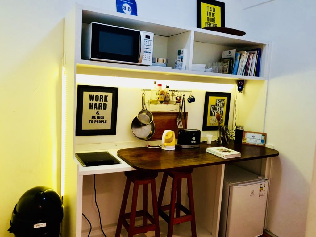Mini – Cozinha compartilhada – Que tal fazer um jantarzinho ? Você pode programar um jantar e comprar os ingredientes online para entrega no dia. A cozinha é um excelente ponto de encontro e onde se descobre talentos na culinária. Este local é utilizado pelos hóspedes para guardar suas bagagens enquanto aguardam o horário do seu check in.